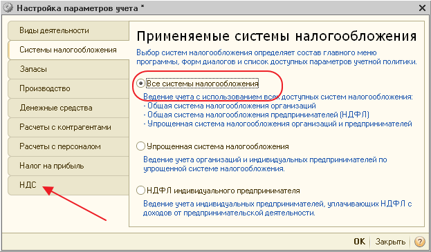 Для того, чтобы включить данную возможность необходимо проверить, что в параметрах учета 1С: Бухгалтерия 2 существует возможность вести учет по всем системам налогообложения (и общей, и упрощенной). Для этого надо зайти в пункт меню «Предприятие-Настройка параметров учета» и зайти на закладку «Системы налогообложения» .