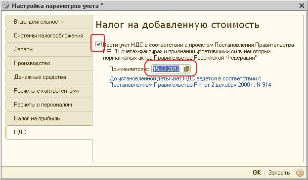 Далее мы переходим на закладку НДС и ставим галочку «Вести учет НДС в соответствии….." и ставим дату с которой в документах Счет фактура выданная появиться возможность печатать новую форму счет-фактуры.